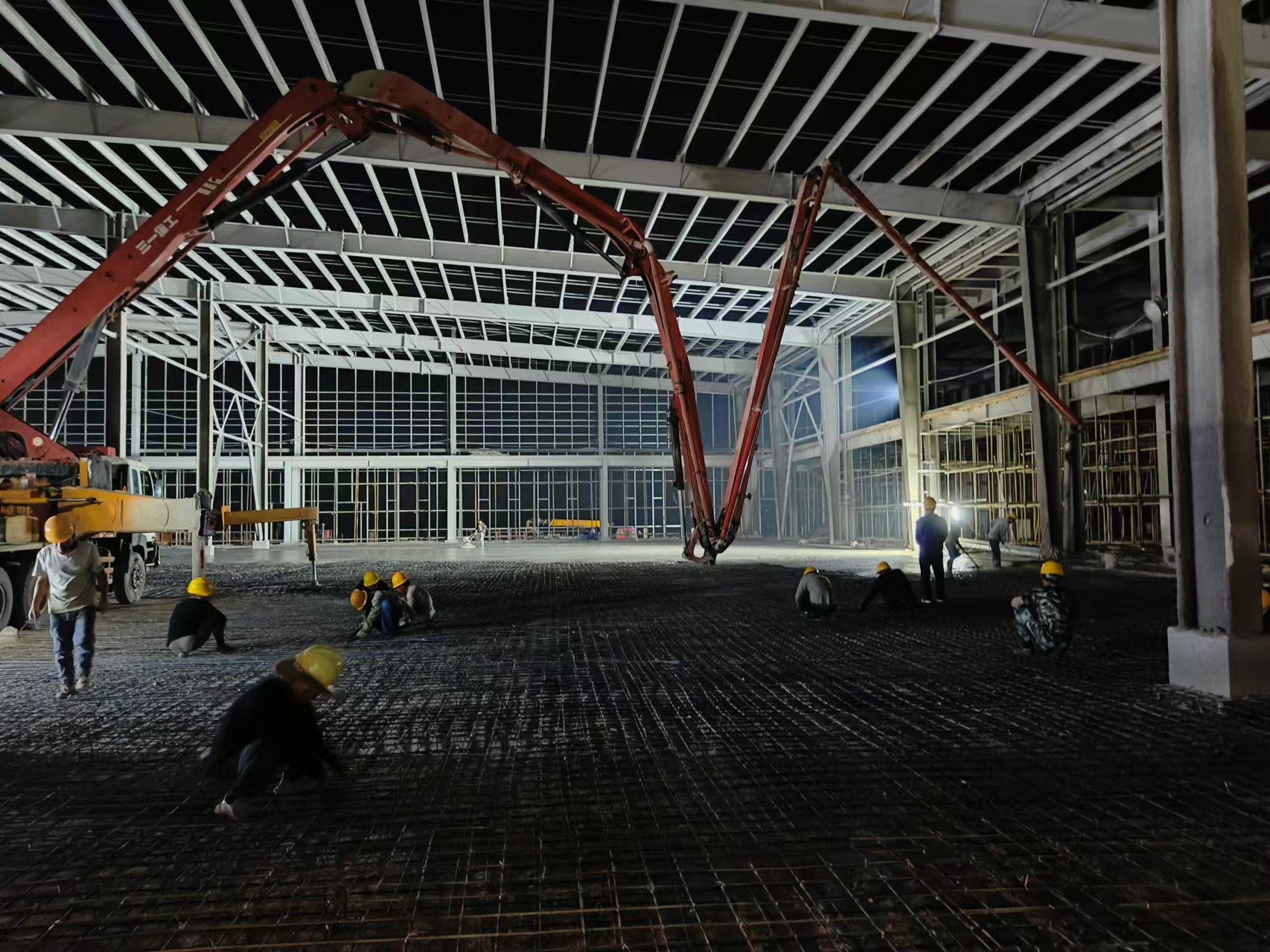 受征拆影響,工期更為緊張,深夜的項(xiàng)目部常常燈火通明,忙碌的身影隨處可見,建設(shè)速度爭分奪秒,全力以赴搭建“物流心臟”。為確保工期不受影響,項(xiàng)目部實(shí)行“兩班倒”工作制,全體人員黑白班輪換,以實(shí)現(xiàn)工地日夜不停工,在現(xiàn)場,工人們干得熱火朝天,各類運(yùn)輸車輛來回穿梭,泵車車臂相互交織,如同“蜘蛛俠”,不斷吞吐著混凝土,辦公室內(nèi),打印機(jī)不停工作,一道道身影連軸忙碌,激烈的討論聲不時從會議室傳出。