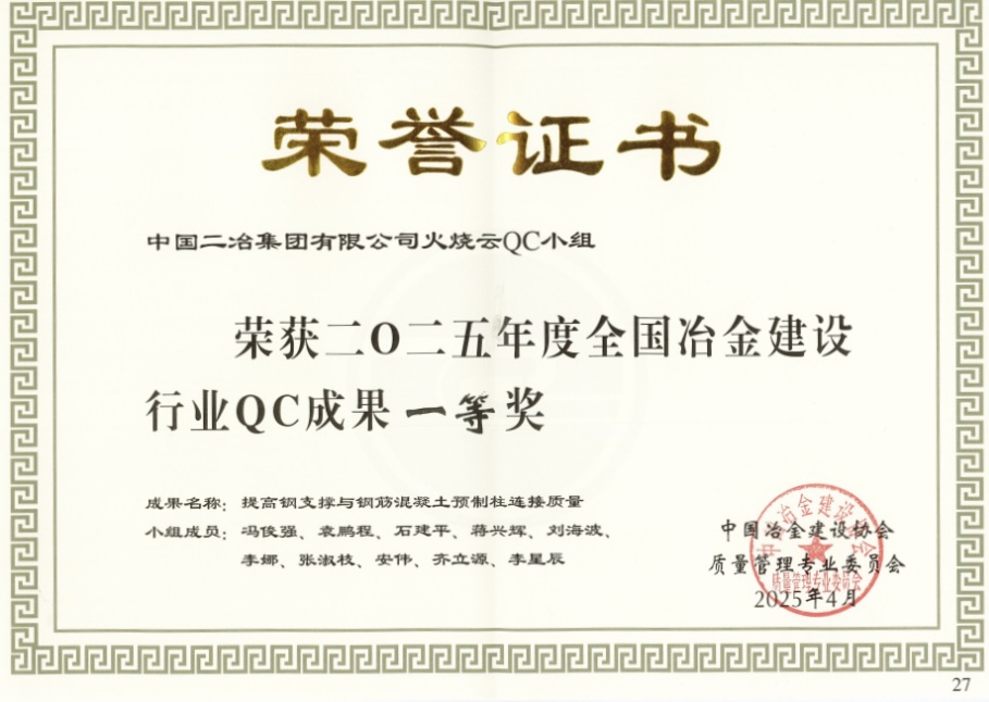2025年4月,冶金分公司新疆火燒云QC小組憑借創(chuàng)新成果《提高鋼支撐與鋼筋混凝土預(yù)制柱連接質(zhì)量》榮獲2025年度全國(guó)冶金建設(shè)行業(yè)QC一等獎(jiǎng)。這一成果不僅提高了鋼支撐與鋼筋混凝土預(yù)制柱連接一次驗(yàn)收合格率,還為新疆火燒云項(xiàng)目的技術(shù)升級(jí)提供了示范性解決方案,展現(xiàn)了中國(guó)二冶冶金分公司的技術(shù)創(chuàng)新實(shí)力。