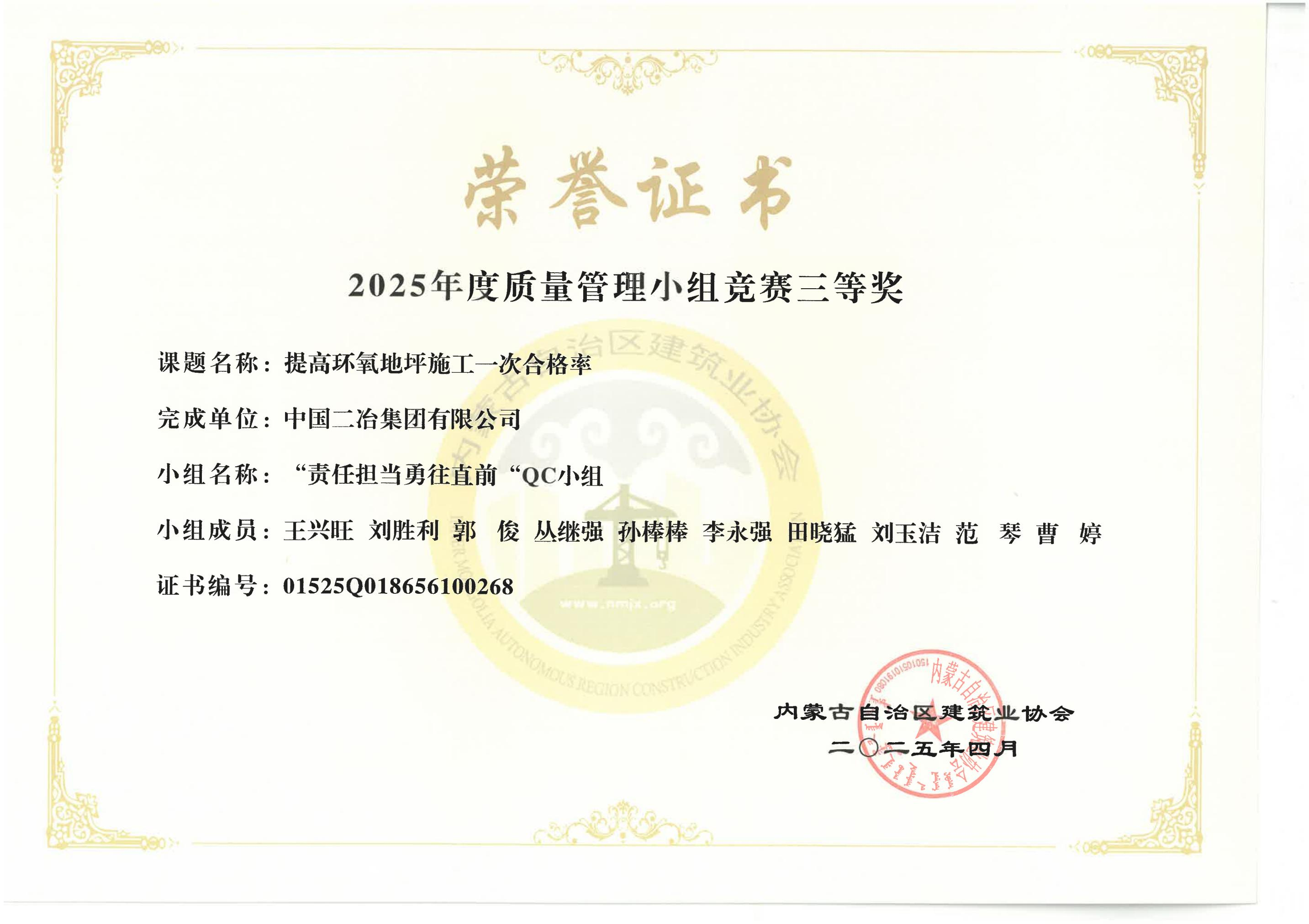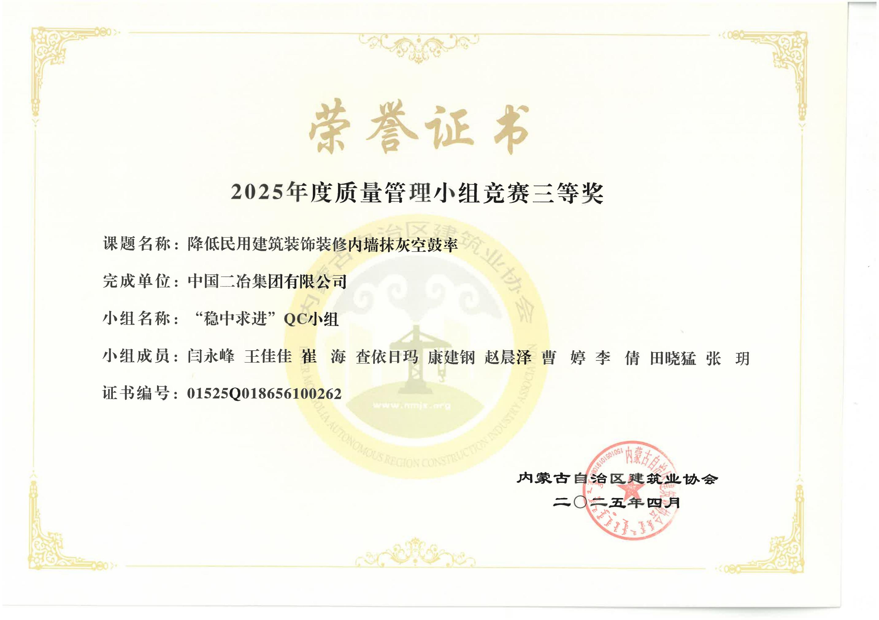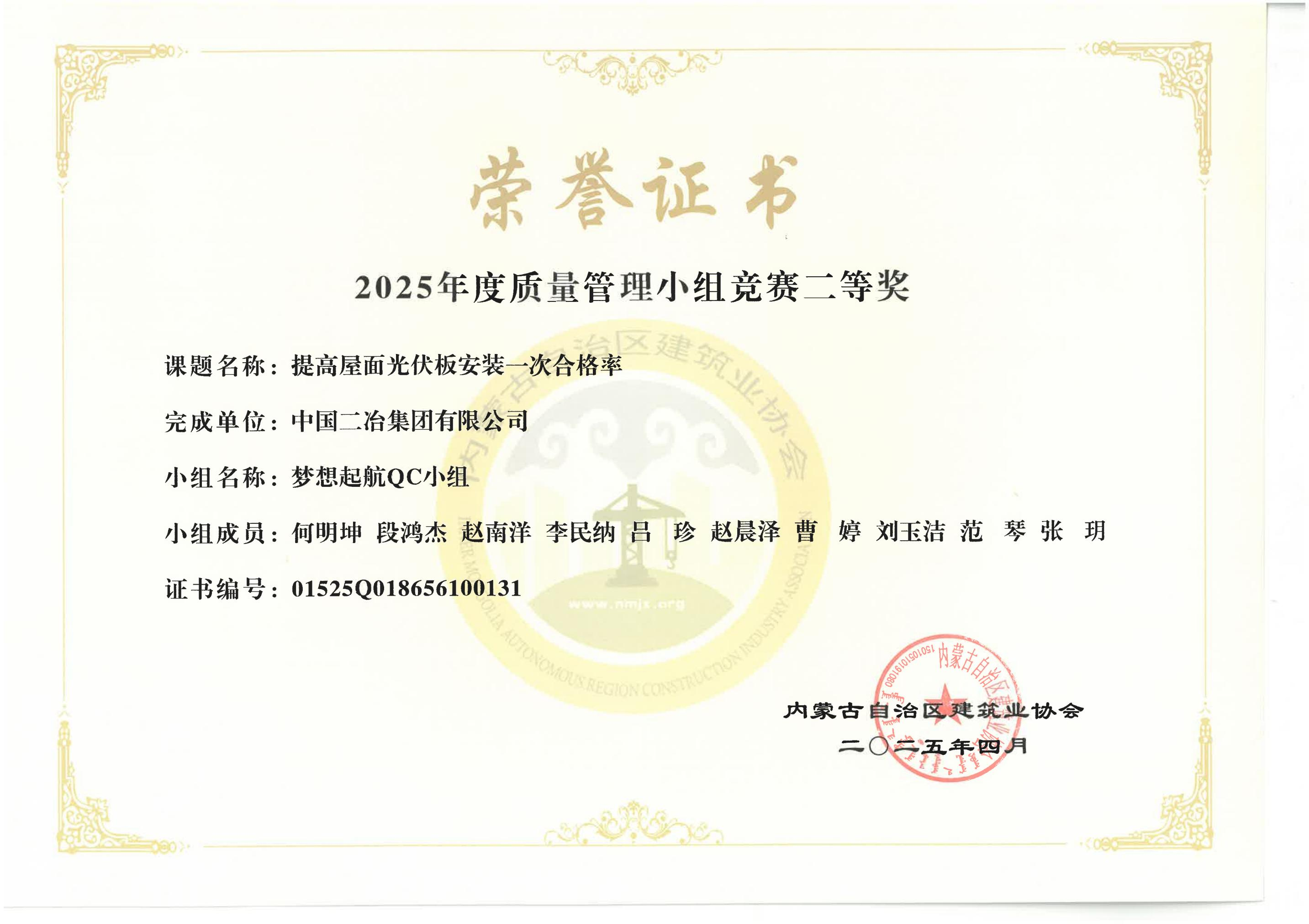 近日,內(nèi)蒙古自治區(qū)建筑業(yè)協(xié)會(huì)舉辦的質(zhì)量管理小組競賽中,市政分公司《提高屋面光伏板安裝一次合格率》榮獲二等獎(jiǎng),《降低民用建筑裝飾裝修內(nèi)墻抹灰空鼓率》、《提高環(huán)氧地坪施工一次合格率》榮獲三等獎(jiǎng)。