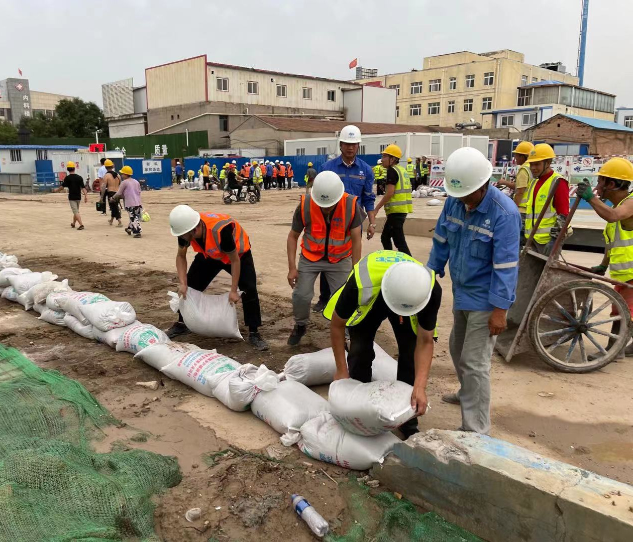 在中儲糧項(xiàng)目,施工現(xiàn)場地處低洼地段,防汛形勢嚴(yán)峻,項(xiàng)目部立即組織防汛排險(xiǎn)隊(duì),進(jìn)行隱患排查,采取有效措施。一是夯實(shí)防汛堤壩。在重要出入口和低洼位置鋪設(shè)沙袋,阻擋雨水倒灌。抽水機(jī)滿負(fù)荷運(yùn)轉(zhuǎn),預(yù)防積水風(fēng)險(xiǎn)。二是開展防汛應(yīng)急演練,組織全體建設(shè)者模擬開展對受損的水電設(shè)施進(jìn)行全面排查修復(fù),調(diào)配生活物資,增強(qiáng)現(xiàn)場施工人員防洪抗汛意識。