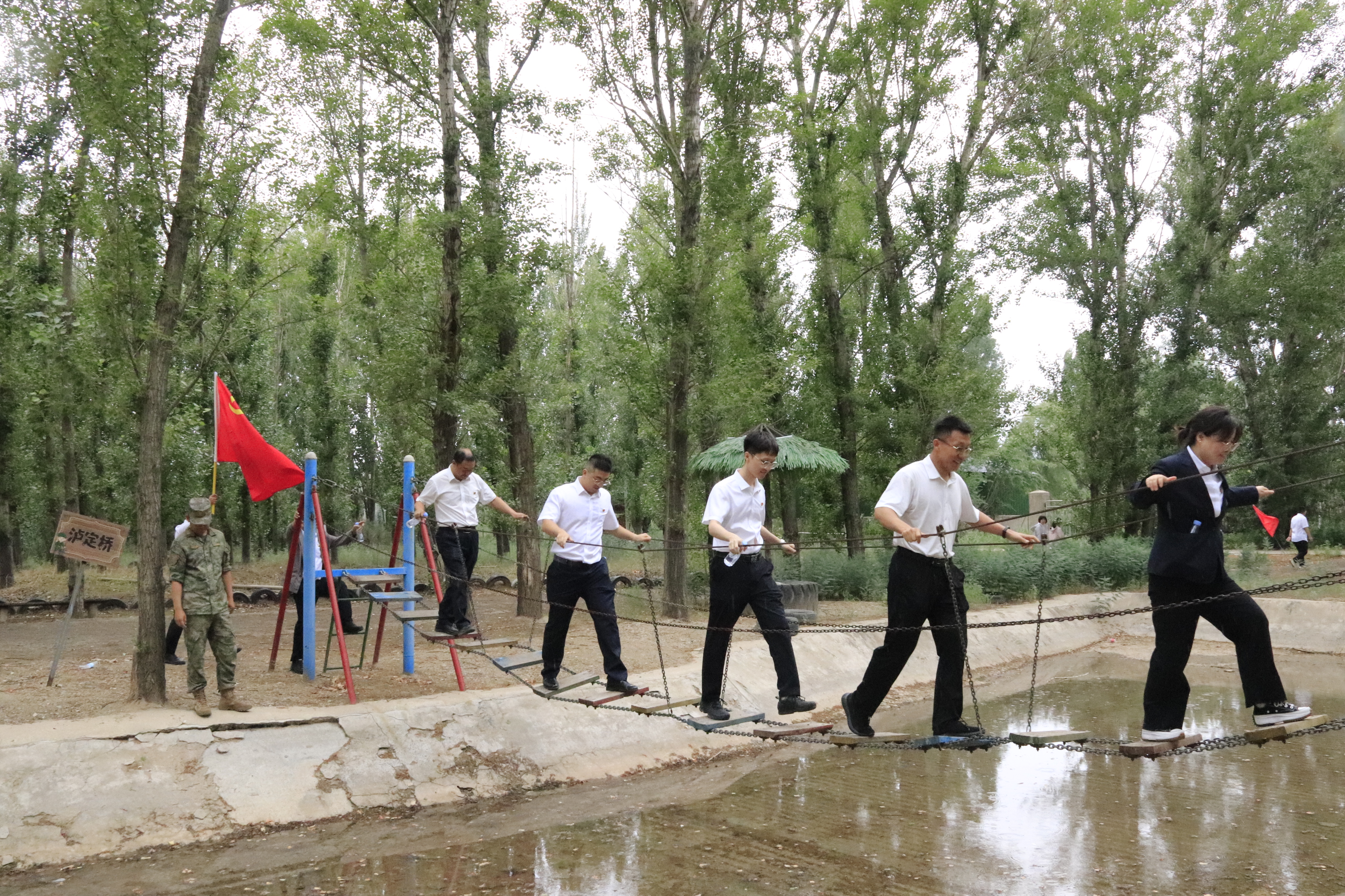 模擬長(zhǎng)征征程的體能訓(xùn)練將活動(dòng)推向高潮。精心設(shè)計(jì)的“血戰(zhàn)湘江”、“飛奪瀘定橋”、“爬雪山過(guò)草地”、“激戰(zhàn)臘子口”、“翻越六盤山”、“陜北大會(huì)師”等項(xiàng)目,生動(dòng)再現(xiàn)了紅軍長(zhǎng)征途中的關(guān)鍵戰(zhàn)役與艱難險(xiǎn)阻。黨員們?cè)凇帮w奪瀘定橋”中體驗(yàn)協(xié)作與勇氣的考驗(yàn),在“爬雪山過(guò)草地”中磨煉耐力與意志,切身感受革命先輩不畏艱險(xiǎn)、勇往直前的英雄氣概和堅(jiān)定信念。盡管汗水浸濕了衣衫,但大家在挑戰(zhàn)中相互鼓勵(lì)、奮勇?tīng)?zhēng)先,以身體力行的方式深刻理解了長(zhǎng)征精神的偉大內(nèi)涵。
