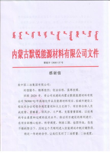 感謝信中指出:回顧2020年,貴公司承建的內(nèi)蒙古默銳能源材料有限公司76500噸電/年高端化學(xué)品及能源材料項目,在中國二冶集團(tuán)及城市建設(shè)工程技術(shù)公司領(lǐng)導(dǎo)高度重視和大力支持下,項目部全體人員戰(zhàn)疫情、冒酷暑、頂風(fēng)沙、斗嚴(yán)寒,克服重重困難,以優(yōu)秀的專業(yè)素質(zhì)和過硬的技術(shù)水平,保證項目建設(shè)的順利進(jìn)行。在項目部精心組織、科學(xué)調(diào)度、倒排工期、掛圖作戰(zhàn),孜孜不倦的努力下,歷時五個月順利進(jìn)入安裝調(diào)試沖刺關(guān)鍵階段。將近一年的合作,讓我們見識了二冶質(zhì)量、二冶速度、二冶力量,充分證明貴公司是一個名副其實的央企實力企業(yè)。項目經(jīng)理部是一個“敬業(yè)、忠誠、擔(dān)當(dāng)、爭先”的優(yōu)秀集體。我公司非常珍惜通過合作凝結(jié)成的深厚友誼和感情,在項目安裝調(diào)試沖刺關(guān)鍵階段,我們將進(jìn)一步加強溝通、精誠合作,全力以赴配合貴公司項目部全體人員,以更加飽滿的熱情,高質(zhì)量完成工程及設(shè)備安裝調(diào)試,圓滿實現(xiàn)試產(chǎn)投產(chǎn)預(yù)定目標(biāo)任務(wù),并向中國二冶所有參建人員表示衷心的感謝和崇高敬意!