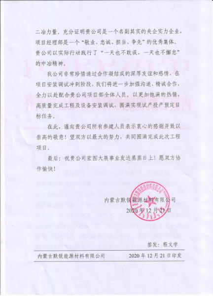 12月21日,內(nèi)蒙古默銳能源材料有限公司向中國二冶集團(tuán)發(fā)來感謝信,對在合作過程中中國二冶集團(tuán)體現(xiàn)央企的實力擔(dān)當(dāng),以及用實際行動踐行的“一天也不耽誤,一天也不懈怠”的中冶精神給予高度贊揚。