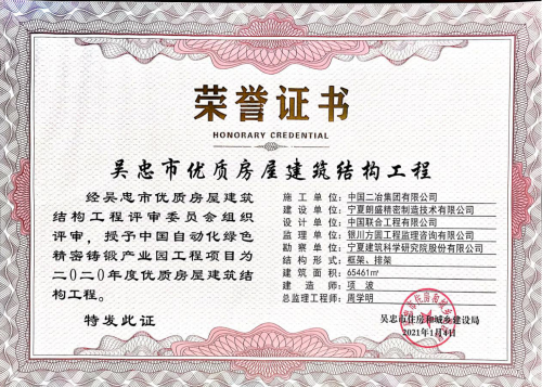 1月4日,寧夏回族自治區(qū)吳忠市住房和城鄉(xiāng)建設(shè)局公布了2020年度吳忠市優(yōu)質(zhì)房屋建筑結(jié)構(gòu)工程獲獎名單,中國二冶集團(tuán)中國自動化綠色精密鑄鍛產(chǎn)業(yè)園項目再次榮獲“吳忠市優(yōu)質(zhì)房屋建筑結(jié)構(gòu)工程”和“吳忠市質(zhì)量標(biāo)化示范工程”稱號。這是繼2020年11月13日獲得“寧夏安全標(biāo)化示范工地”后,中國二冶該項目獲得的另一殊榮。