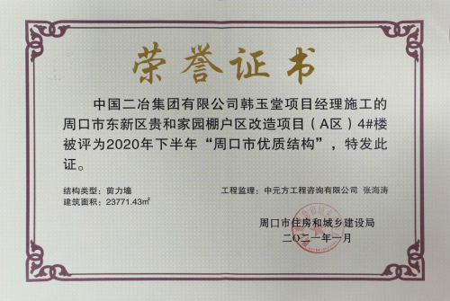 1月18日,河南省周口市住房和城鄉(xiāng)建設(shè)局公布2020年下半年“周口市優(yōu)質(zhì)結(jié)構(gòu)”單位,中國二冶周口市東新區(qū)貴和家園棚戶區(qū)改造項目(A區(qū))4#樓工程榮獲“周口市優(yōu)質(zhì)結(jié)構(gòu)”榮譽稱號。
