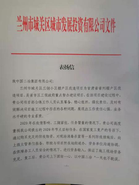 2月5日,中國(guó)二冶蘭鋼小區(qū)棚戶區(qū)改造項(xiàng)目(一期住宅)施工一標(biāo)段工程項(xiàng)目經(jīng)理部收到蘭州市城關(guān)區(qū)城市發(fā)展投資有限公司的表?yè)P(yáng)信,這是業(yè)主對(duì)中國(guó)二冶良好工作作風(fēng)和積極工作態(tài)度的肯定及高度贊揚(yáng)。
