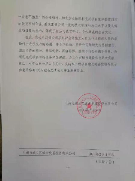 表?yè)P(yáng)信充分肯定了中國(guó)二冶甘肅分公司蘭鋼項(xiàng)目部在2020年疫情影響、工期緊張等一系列困難下,能夠上下一心,克服各種不利因素的影響,按期完成既定任務(wù)目標(biāo),在建設(shè)中的大力支持與配合表示誠(chéng)摯的感謝。2020年復(fù)工以來(lái),為確保施工的連續(xù)性和節(jié)奏性,蘭鋼項(xiàng)目部投入了大量的人力、物資、機(jī)械設(shè)備,與施工隊(duì)伍積極協(xié)調(diào)溝通,凝心聚力保工期,緊抓細(xì)節(jié)不放松。在公司的大力支持下,在建設(shè)單位、監(jiān)理單位的不斷努力和辛勤付出下,經(jīng)過(guò)項(xiàng)目部全體人員加班加點(diǎn),夜以繼日地奮戰(zhàn),該項(xiàng)目主體結(jié)構(gòu)正式封頂,順利完成年底節(jié)點(diǎn)目標(biāo),向業(yè)主遞交了一份滿意的答卷,充分展示了中國(guó)二冶的技術(shù)實(shí)力和良好形象。
