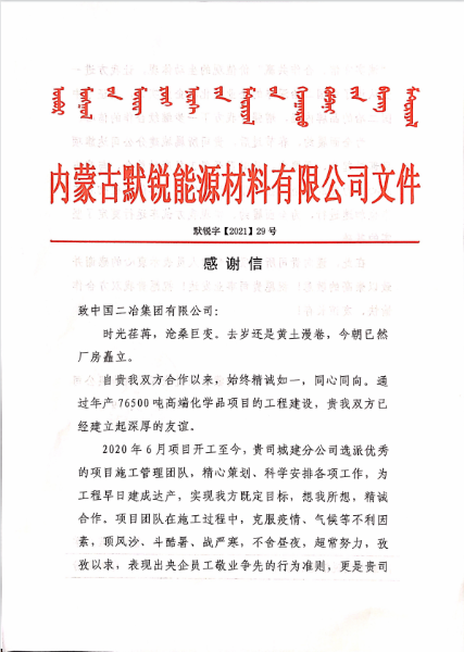 4月19日,內蒙古默銳能源材料有限公司向中國二冶發(fā)來感謝信,對在合作過程中所見證的中國二冶作為央企的實力擔當,以及用實際行動踐行的“一天也不耽誤,一天也不懈怠”的企業(yè)精神給予高度贊揚;對城建分公司領導給予該工程的高度重視、大力支持表示衷心感謝;對承擔該工程建設任務的達旗項目部全體工作人員以優(yōu)秀的專業(yè)素質和過硬的技術水平,保證項目的順利進行給予充分肯定和高度贊揚。