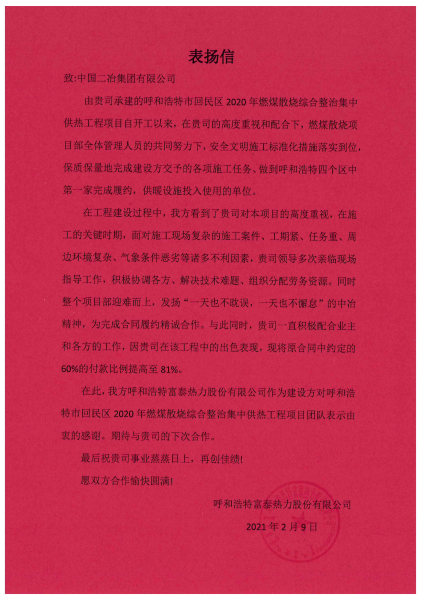 4月30日,內(nèi)蒙古分公司赤峰市開發(fā)試驗(yàn)區(qū)孵化基地項(xiàng)目收到了來自赤峰市資源型城市經(jīng)濟(jì)轉(zhuǎn)型開發(fā)試驗(yàn)區(qū)管理委員會的一封表揚(yáng)信。業(yè)主方表示,由我公司承建的開發(fā)試驗(yàn)區(qū)高新技術(shù)產(chǎn)業(yè)中試孵化基地(一期)建設(shè)工程一標(biāo)段項(xiàng)目作為赤峰市重點(diǎn)建設(shè)項(xiàng)目,自開工以來備受社會各界關(guān)注。中國二冶作為承建方,在工程建設(shè)過程當(dāng)中保質(zhì)保量完成任務(wù),盡職盡責(zé)體現(xiàn)企業(yè)精神,值得稱贊表揚(yáng)!