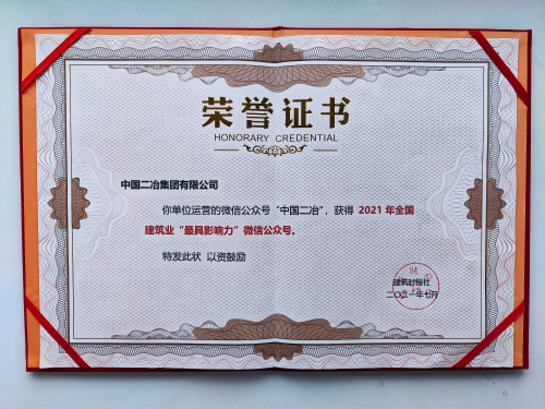 “中國二冶”微信公眾號憑借獨特的審美設(shè)計能力、深入透徹的分析思考、及時準(zhǔn)確的新聞資訊和豐富精彩的企業(yè)文化互動方式,以及引起廣泛關(guān)注和討論的大量原創(chuàng)觀點,在孜孜不倦的運營、維護、更新下,終獲肯定,榮獲“2021年全國建筑業(yè)最具影響力公眾號”的榮譽稱號;此獎項的獲得進一步提升了中國二冶的品牌知曉度和社會影響力,為公司高質(zhì)量穩(wěn)健發(fā)展?fàn)I造了良好氛圍。