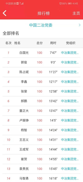 本次黨史知識競賽,內容涵蓋了習近平《論中國共產黨歷史》、《毛澤東、鄧小平、江澤民、胡錦濤關于中國共產黨歷史論述摘編》、《習近平新時代中國特色社會主義思想學習問答》、《中國共產黨簡史》等黨史內容。競賽依托五礦智慧黨建app平臺進行,競賽共300道試題,包括單項選擇、多項選擇。在競賽時間內可以隨時參與答題。后臺會根據答題的正確率由高到低進行排列,正確率相同的,將已答題用時進行排序。在答題競賽中,每位黨員積極思考,認真答題,踴躍參與,不少黨員紛紛表示,通過這個知識競賽,使黨史、黨章、黨規(guī)都印在腦海里,理解也深刻。希望公司今后能多舉辦類似活動,提升黨員政治理論知識與黨員思想覺悟能力,爭做優(yōu)秀共產黨員。本次黨史知識競賽活動,公司共有1560名黨員干部踴躍參加,經過激烈角逐,來自四川分公司的白國光以7分47秒的優(yōu)異成績取得滿分,獲得本次競賽活動的一等獎;來自市政分公司的郭俊等5名黨員獲得二等獎;來自華東分公司的王成軍等10名黨員獲得三等獎;來自甘肅分公司的高國義等30名黨員獲得優(yōu)秀獎。