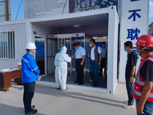 劉海泉一行首先深入施工現(xiàn)場,對進(jìn)場務(wù)工人員來源地、供貨商貨源地等一些項(xiàng)目基本概況進(jìn)行了解,并對現(xiàn)場體溫測量登記臺賬、外來人員進(jìn)場登記臺賬、現(xiàn)場行程碼和健康碼設(shè)置情況、施工現(xiàn)場作業(yè)人員口罩佩戴情況,以及辦公區(qū)每日消殺記錄進(jìn)行詳細(xì)檢查。隨后,劉海泉一行來到項(xiàng)目隔離區(qū),仔細(xì)檢查了現(xiàn)場隔離室設(shè)置情況,并叮囑項(xiàng)目部管理人員,隔離間的配備要符合要求,確保安全可靠。