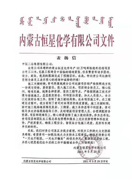 9月29日,內(nèi)蒙古恒星化學(xué)有限公司發(fā)來表揚(yáng)信,對(duì)中國(guó)二冶及達(dá)旗項(xiàng)目部精心組織、精準(zhǔn)實(shí)施表示由衷感謝,對(duì)統(tǒng)籌各種資源、落實(shí)工期節(jié)點(diǎn)、嚴(yán)格按照施工技術(shù)步驟與措施施工給予高度贊揚(yáng)。