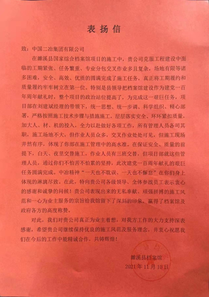 11月10日,濉溪縣檔案館致中國(guó)二冶表?yè)P(yáng)信,對(duì)中國(guó)二在濉溪國(guó)家檔案館EPC總承包項(xiàng)目建設(shè)中,克服工程建設(shè)工期緊張、任務(wù)繁重、專業(yè)交叉作業(yè)多、場(chǎng)地有限等諸多困難,安全、優(yōu)質(zhì)、高效地圓滿完成施工任務(wù)給予表?yè)P(yáng)。