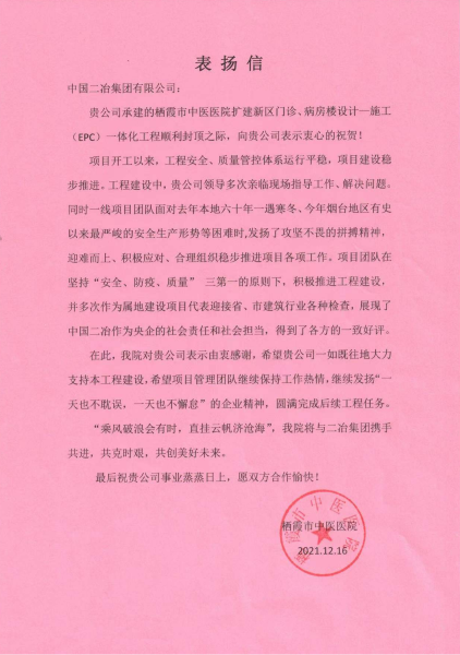 12月16日,由中國二冶承建的棲霞市中醫(yī)醫(yī)院擴建工程項目順利封頂。中國二冶在喜慶氛圍中收到業(yè)主單位棲霞市中醫(yī)院發(fā)來的表揚信,表揚信對中國二冶項目團隊在該工程施工過程中所取得的成績給與肯定,并對項目團隊奮勇拼搏的精神予以高度贊揚。