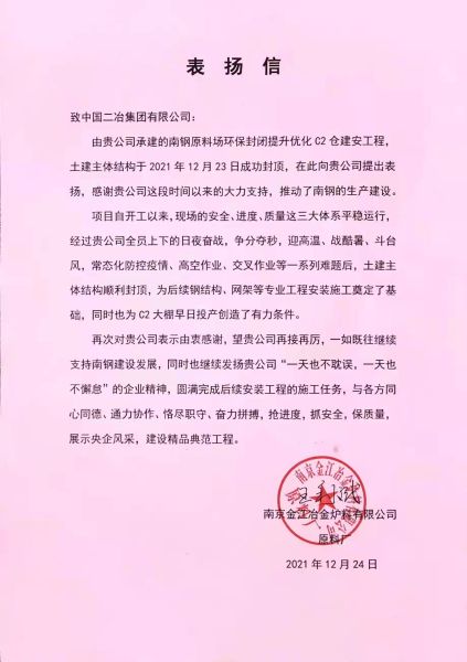 12月24日,南京金江冶金爐料有限公司再次向中國二冶致表揚信,對土建主體結(jié)構(gòu)成功封頂提出表揚,同時對中國二冶在C2倉項目工程建設(shè)中所展現(xiàn)出的高水平施工作業(yè)與高效化管理能力表示高度肯定。
