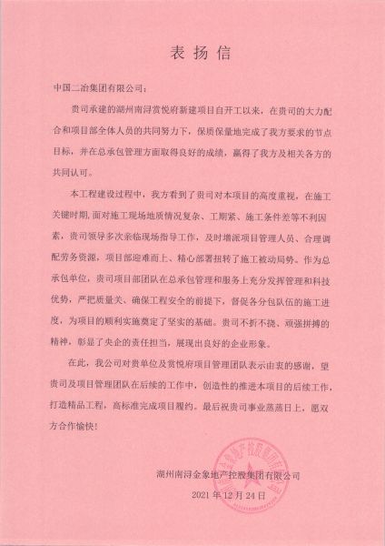 12月28日,湖州南潯金象地產(chǎn)控股集團有限公司致中國二冶表揚信。信中對中國二冶路橋分公司南潯賞悅府住宅小區(qū)新建工程項目部夜以繼日、靶向管理、有序施工,保質(zhì)保量地完成業(yè)主方要求節(jié)點目標,用實際行動闡釋工程建設(shè)高效履約表示高度贊揚。