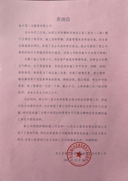 12月29日,沈丘縣城區(qū)改造建設(shè)投資開(kāi)發(fā)有限公司向中國(guó)二冶發(fā)來(lái)表?yè)P(yáng)信,對(duì)中國(guó)二冶各級(jí)領(lǐng)導(dǎo)給予工程高度重視和大力支持表示衷心感謝,對(duì)該項(xiàng)目自開(kāi)工建設(shè)以來(lái),項(xiàng)目部全體人員所付出的努力和艱辛給予肯定和表?yè)P(yáng)。