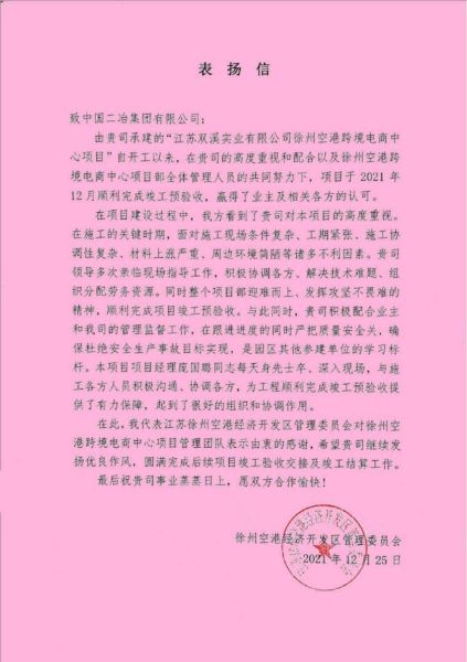 12月30日,中國(guó)二冶收到徐州空港經(jīng)濟(jì)開(kāi)發(fā)區(qū)管委會(huì)表?yè)P(yáng)信,對(duì)項(xiàng)目于12月25日順利完成竣工預(yù)驗(yàn)收給予表?yè)P(yáng),對(duì)中國(guó)二冶徐州空港跨境電商中心項(xiàng)目管理團(tuán)隊(duì)表示由衷的感謝。信中寫到,在項(xiàng)目建設(shè)過(guò)程中,我方看到了貴司對(duì)本項(xiàng)目的高度重視. 在施工的關(guān)鍵時(shí)期,面對(duì)施工現(xiàn)場(chǎng)條件復(fù)雜、工期緊張、施工協(xié)調(diào)性復(fù)雜、材料上漲嚴(yán)重、周邊環(huán)境簡(jiǎn)陋等諸多不利因素,貴司領(lǐng)導(dǎo)多次親臨現(xiàn)場(chǎng)指導(dǎo)工作,積極協(xié)調(diào)各方、解決技術(shù)難題。同時(shí)整個(gè)項(xiàng)目團(tuán)隊(duì)迎難而上、發(fā)揮攻堅(jiān)不畏難的精神,順利完成項(xiàng)目竣工預(yù)驗(yàn)收,是園區(qū)其他參建單位的學(xué)習(xí)標(biāo)桿。