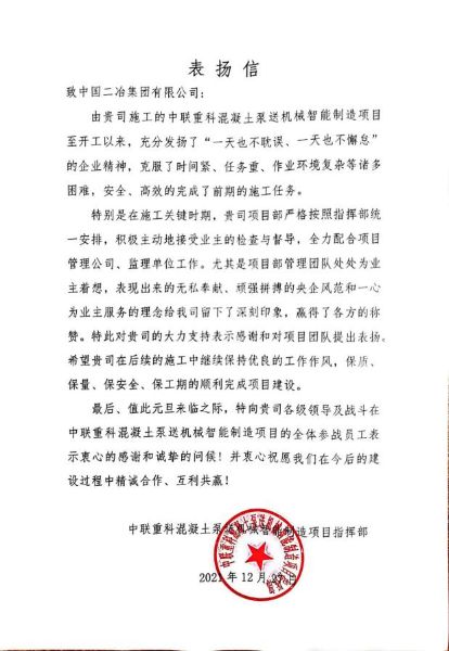 12月27日,中聯(lián)重科混凝土泵送機(jī)械智能制造項(xiàng)目指揮部向中國(guó)二冶致表?yè)P(yáng)信,對(duì)中國(guó)二冶項(xiàng)目部安全高效的完成項(xiàng)目前期施工任務(wù)表示感謝。信中指出,在施工關(guān)鍵時(shí)期,中國(guó)二冶中聯(lián)重科項(xiàng)目部嚴(yán)格按照指揮部統(tǒng)一安排,積極主動(dòng)地接受業(yè)主的檢查與督導(dǎo),全力配合項(xiàng)目管理公司、監(jiān)理單位工作。特別是項(xiàng)目管理團(tuán)隊(duì)處處為業(yè)主著想及吃苦耐勞,頑強(qiáng)拼搏的工作作風(fēng)給我們留下了深刻印象,贏得了各方的稱贊。希望中國(guó)二冶項(xiàng)目團(tuán)隊(duì)在后續(xù)的施工中繼續(xù)保持優(yōu)良的工作作風(fēng),保質(zhì)、保量、保安全、保工期的順利完成項(xiàng)目建設(shè)任務(wù)。