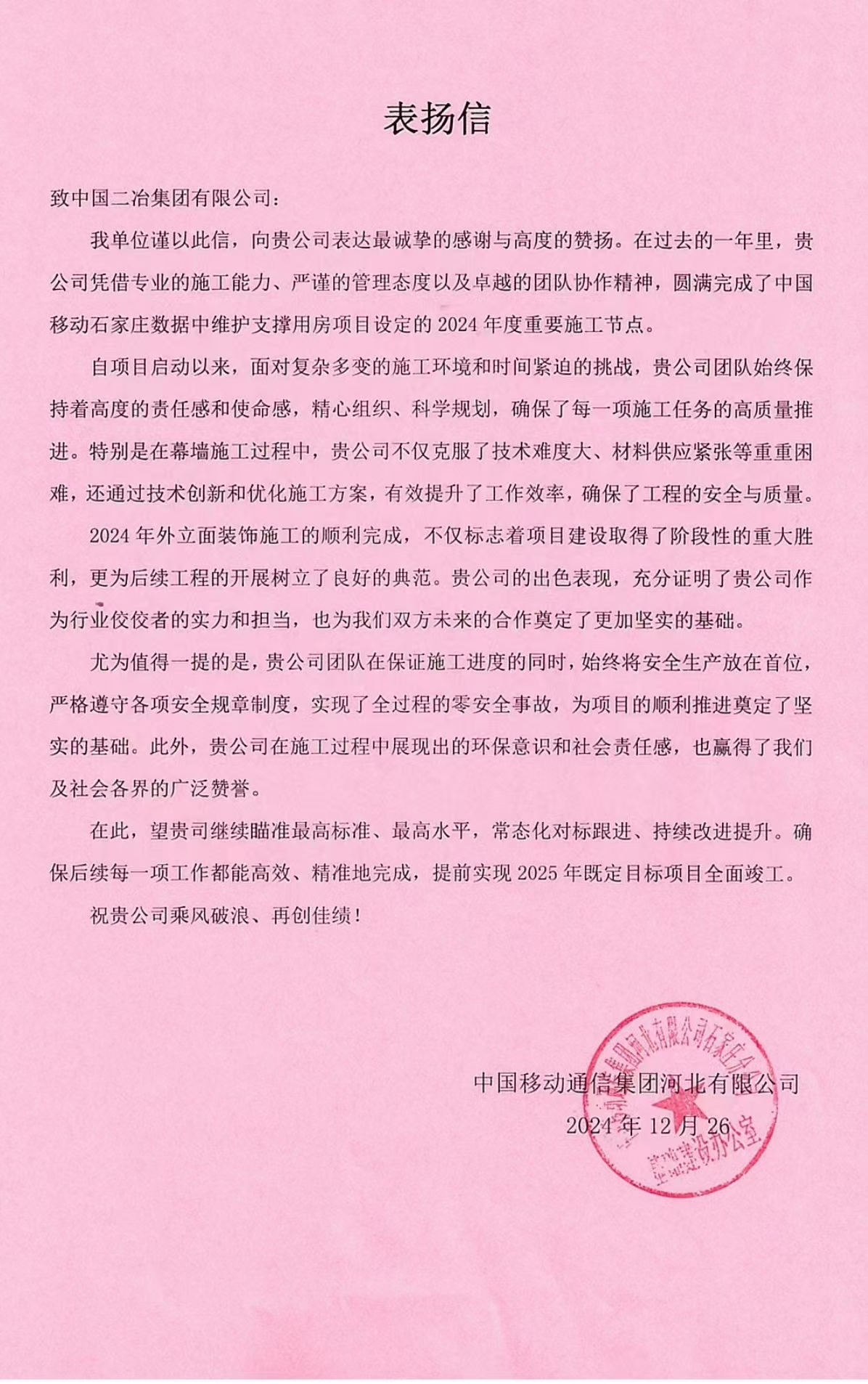 12月27日,中國二冶收到一封來自中國移動河北分公司的表揚(yáng)信,信中對公司在項目施工中所展現(xiàn)出的綜合實(shí)力表示肯定。