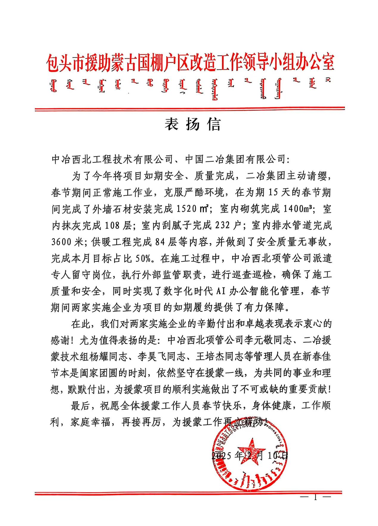 信中指出,為了今年項(xiàng)目保質(zhì)保量,如期竣工交付,中國二冶主動(dòng)請(qǐng)纓,春節(jié)期間克服嚴(yán)酷環(huán)境,正常施工作業(yè)不打烊,在短短的15天節(jié)日里完成外墻石材1520㎡、室內(nèi)砌筑1400m3、室內(nèi)抹灰108層、室內(nèi)刮膩?zhàn)?32戶、室內(nèi)排水管道3600米、供暖工程84層等施工內(nèi)容,并做到了安全質(zhì)量無事故,完成本月網(wǎng)絡(luò)節(jié)點(diǎn)目標(biāo)占比50%,全面實(shí)現(xiàn)履約目標(biāo),充分彰顯了中國央企的硬核實(shí)力和責(zé)任擔(dān)當(dāng)。
