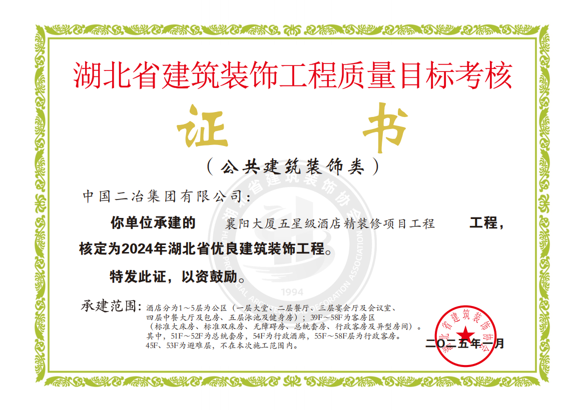 近日,湖北省建筑裝飾協(xié)會(huì)發(fā)布2024年度“湖北省優(yōu)良建筑裝飾工程”評選結(jié)果,中國二冶襄陽大廈五星級(jí)酒店精裝修項(xiàng)目榮獲2024年“湖北省優(yōu)良建筑裝飾工程”。