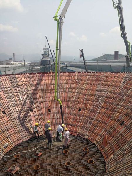 廣元中孚綠色鋁材項目電解車間一工段氧化鋁供配料含氟倉,其高21.55米,上部漏斗采用混凝土結(jié)構(gòu),漏斗上部直徑19.3米,下部直徑8.4米,施工難度非常大。面對這項艱巨的施工任務,雖然難度很大,但項目部技術(shù)組人員迎難而上,經(jīng)過認真計算和與相關(guān)專家的積極溝通,制定了細致周密的施工方案,通過各方專家論證,最終敲定了實施方案。項目部制定了相應的安全措施及質(zhì)量目標,在兩個月零六天的奮戰(zhàn)中,相繼完成架手架搭設、鋼筋綁扎、模板支護等所有任務,5月28日,監(jiān)理、業(yè)主等相關(guān)方通過檢查認證,確認符合澆筑條件,并下達了澆筑令。項目部立即組織施工,技術(shù)質(zhì)量安全等黨員責任區(qū)及突擊隊員緊盯施工現(xiàn)場執(zhí)行監(jiān)護,20多個小時連續(xù)作業(yè)后,于是5月29日凌晨4點30分,順利完成了施工任務,項目部又啃下了一塊硬骨頭,為整體工程順利完工奠定了基礎(chǔ)。