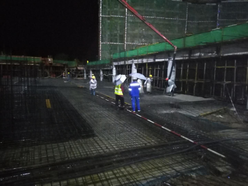 廣元康養(yǎng)園項目13號樓及周邊裙樓總面積819.35 ㎡。自5月22日晚上完成混凝土墊層澆筑后,為做到施工銜接有序,項目部合理組織人力、物力、機(jī)械,僅用10天時間完成了磚胎膜、防水、鋼筋等施工任務(wù),達(dá)到了地下室筏板混凝土的澆筑條件。6月1日晚間19:20,第一車混凝土緩緩駛?cè)胧┕がF(xiàn)場,作業(yè)人員馬上進(jìn)入施工狀態(tài)。晚上20:00,天空突然下起了中雨,但也阻擋不了施工人員的勞動熱情。大家穿上雨衣,帶上安全帽,奮戰(zhàn)在施工一線。技術(shù)人員堅守施工現(xiàn)場,制定雨天施工應(yīng)急措施和施工方案,保證施工進(jìn)度不斷向前推進(jìn)。