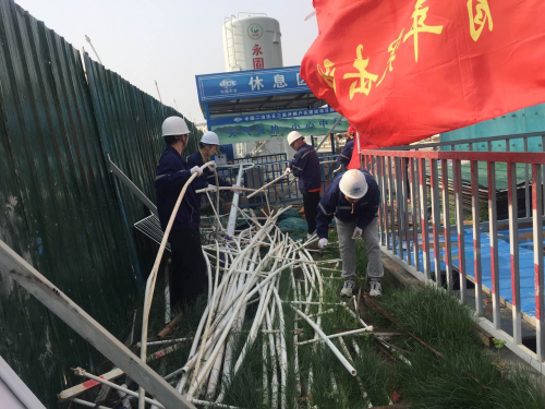 在義務(wù)勞動(dòng)活動(dòng)中,團(tuán)旗和青年突擊隊(duì)旗在工地迎風(fēng)飄揚(yáng),項(xiàng)目部團(tuán)員青年們利用手推車、三輪車對(duì)施工現(xiàn)場(chǎng)的廢棄鋼筋、土方布、鋼管,pvc水管等施工材料進(jìn)行了統(tǒng)一清理和歸類堆放,在搬運(yùn)施工材料的過(guò)程中,大家采取接力的形式將一車車施工材料堆放整齊,將廢棄物清理干凈,雖然大家干的汗流浹背,但始終歡聲笑語(yǔ)、干勁十足,沒(méi)有絲毫的停歇。