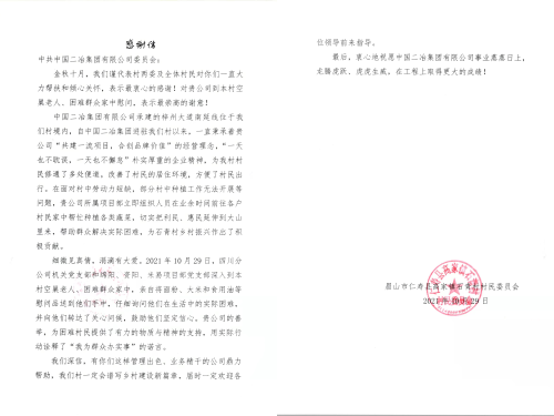 10月29日,中國二冶收到一封來自眉山市仁壽縣高家鎮(zhèn)石青村村民委員會的感謝信。