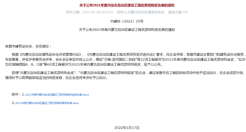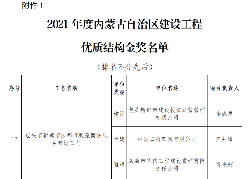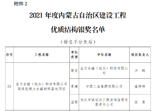 1月19日,由內(nèi)蒙古自治區(qū)建筑業(yè)協(xié)會(huì)發(fā)布,經(jīng)過專家組層層審查、評(píng)審,中國二冶兩項(xiàng)目喜獲2021年度內(nèi)蒙古自治區(qū)建設(shè)工程優(yōu)質(zhì)結(jié)構(gòu)獎(jiǎng)。其中,中國二冶城建分公司包頭市新都市區(qū)都市庭苑商住項(xiàng)目榮獲2021年度內(nèi)蒙古自治區(qū)建設(shè)工程優(yōu)質(zhì)結(jié)構(gòu)金獎(jiǎng),金力永磁(包頭)科技有限公司高性能稀土永磁材料基地項(xiàng)目獲得優(yōu)質(zhì)結(jié)構(gòu)獎(jiǎng)(銀獎(jiǎng)),為二冶獎(jiǎng)牌榜再添殊榮。